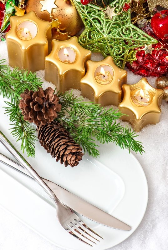 Christmas Table Setting With Holiday Decorations Stock Photo
